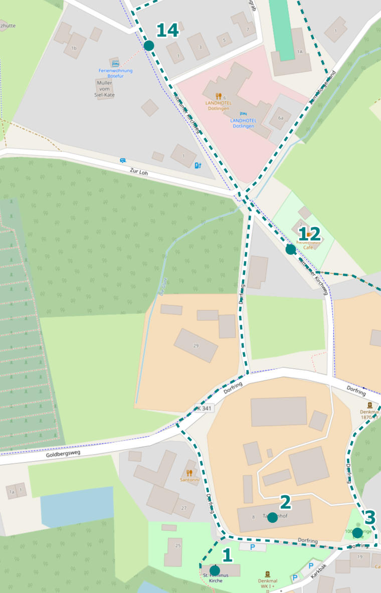 abzubiegen. Folge der Straße zurück zur Kirche.