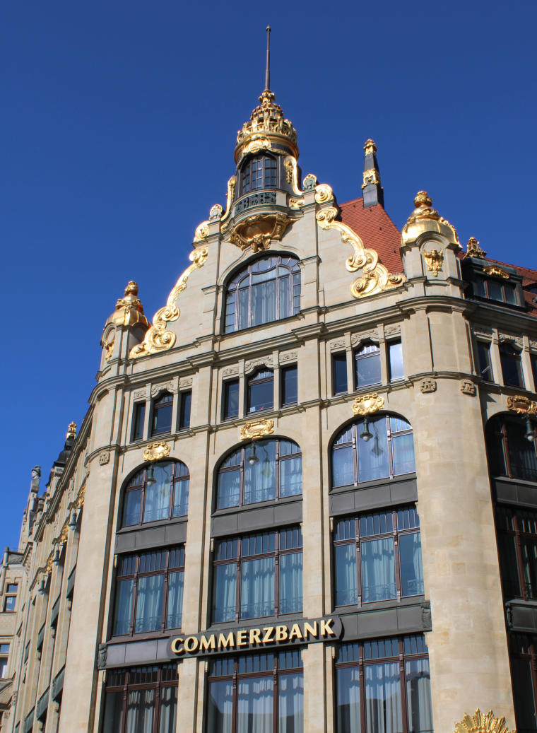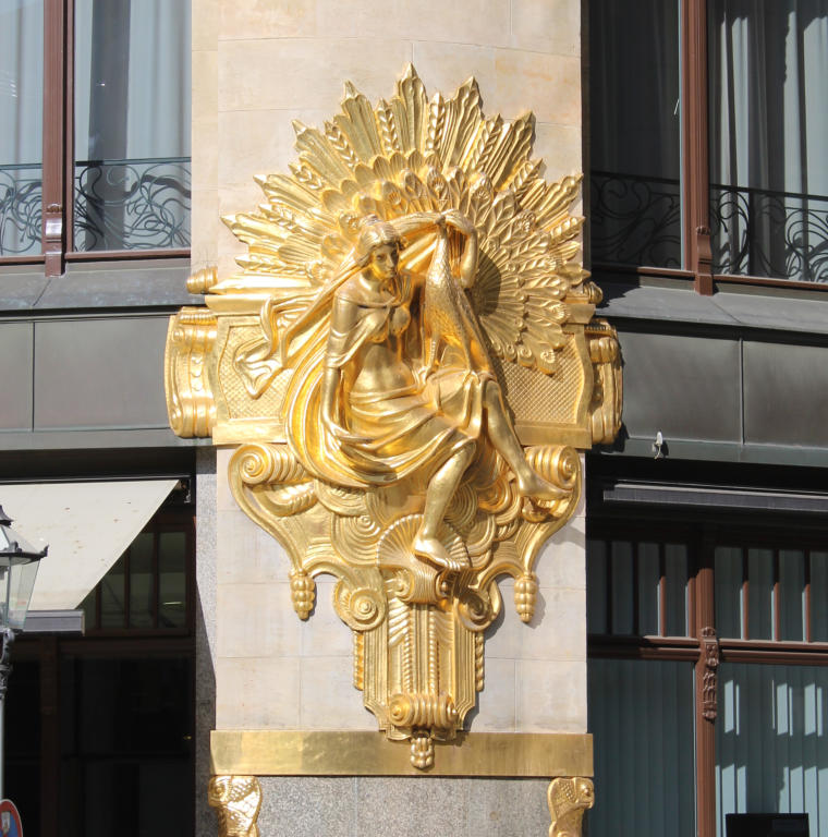 Das Gebäude des ehemaligen Kaufhauses Ebert wurde 1904 im Jugendstil fertiggestellt. Besonders sehenswert sind die zahlreichen vergoldeten Schmuckelemente an der Fassade, vor allem die goldene Krone am Giebel. Seitlich des Haupteingangs kommen zwei größere, vergoldete Figuren vor. Sie stellen Eitelkeit und Genusssucht dar.