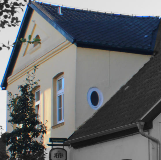 Neoklassistisches Zwerchhaus (farblich hervorgehoben). Als Zwerchhaus wird ein Giebel bezeichnet, der geschosshoch ist, oder sogar über mehrere Etagen reicht.