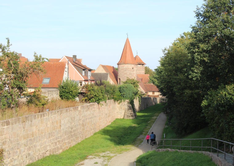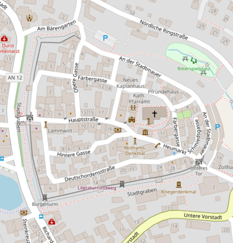 Der Verlauf der Stadtmauer von Obereschenbach zeichnet eine Form nach, die entfernt an ein mittelalterliches Schild erinnert. Vermutlich ist dies beim Anlegen der Planstadt vom Deutschen Orden bewusst so gewählt worden. Diese Stadtmauerform hatte eine strategische, vor allem jedoch auch eine symbolische Bedeutung. Der Schild ist ein klassisches Symbol für Schutz, Verteidigung und Ritterlichkeit, was die Ideale des Deutschen Ordens und seiner Herrschaft über die Stadt widerspiegelte. Die Form war daher vielleicht ein architektonischer Ausdruck der engen Verbindung zwischen der Stadt und dem Orden. Außerdem bot die schildartige Form ideale Voraussetzungen für eine gute Verteidigung. Eine kompakte und klar definierte Mauerlinie erleichterte die Überwachung und Verteidigung, da sie weniger Schwachstellen bot.Die Stadtmauer hatte umlaufend eine zweite Mauer, die Zwingermauer. Der so entstandene Raum zwischen den Mauern war der Zwinger, der im Mittelalter als eines der effektivsten Verteidigungsbauwerke galt. Vor der Stadtmauer lag ein Graben.Die Stadtmauertürme wurden durch ein Spitzdach abgeschlossen. Sie waren durch die typisch mittelalterlichen Biberschwänze gedeckt. Der Name leitet sich von ihrer länglichen, flachen Form mit einem abgerundeten Ende ab, die an den Schwanz eines Bibers erinnert. Biberschwänze werden in „Doppeldeckung“ verlegt, also die Ziegel werden in zwei Lagen versetzt übereinander angeordnet.