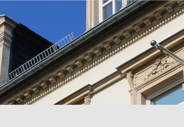 Unter dem Dach verlaufen zwei Friese. Ein