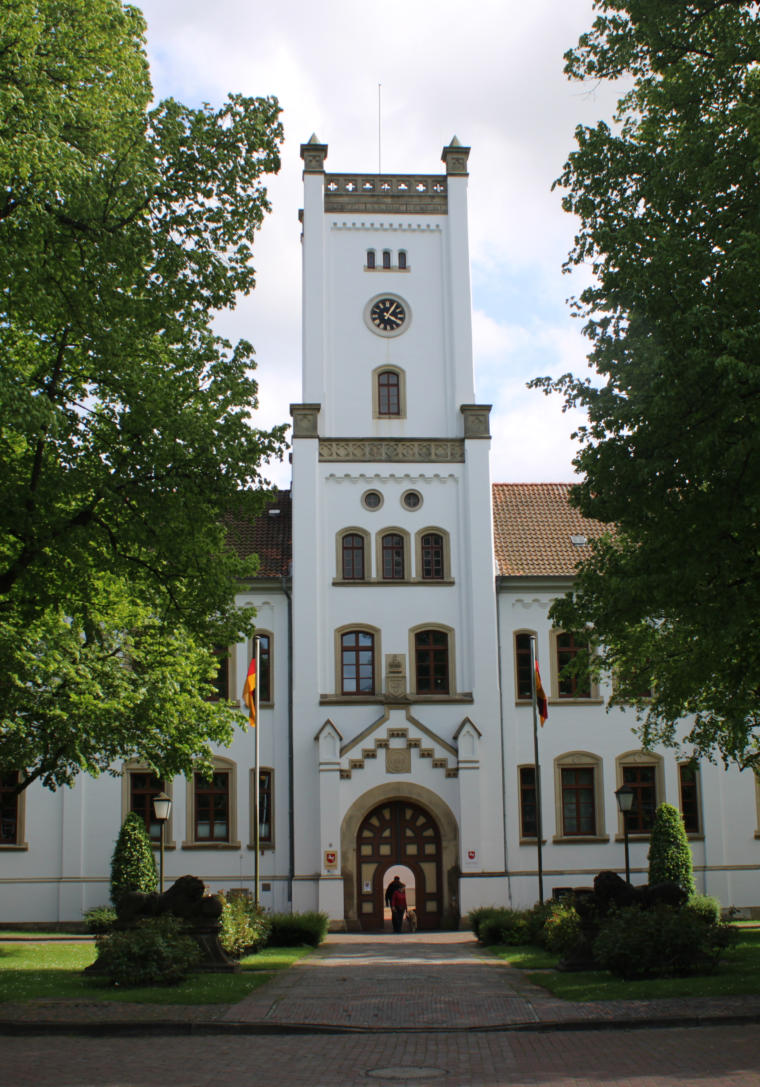 Das heutige Schlossgebäude wurde nie als solches genutzt, sondern war immer ein staatlicher Verwaltungsbau. Das Gebäude wurde 1852 im Neu-Tudorstil fertiggestellt. Damals war Aurich Teil des Königreichs Hannover, womit sich dieser für Ostfriesland sehr außergewöhnliche Baustil erklärt.