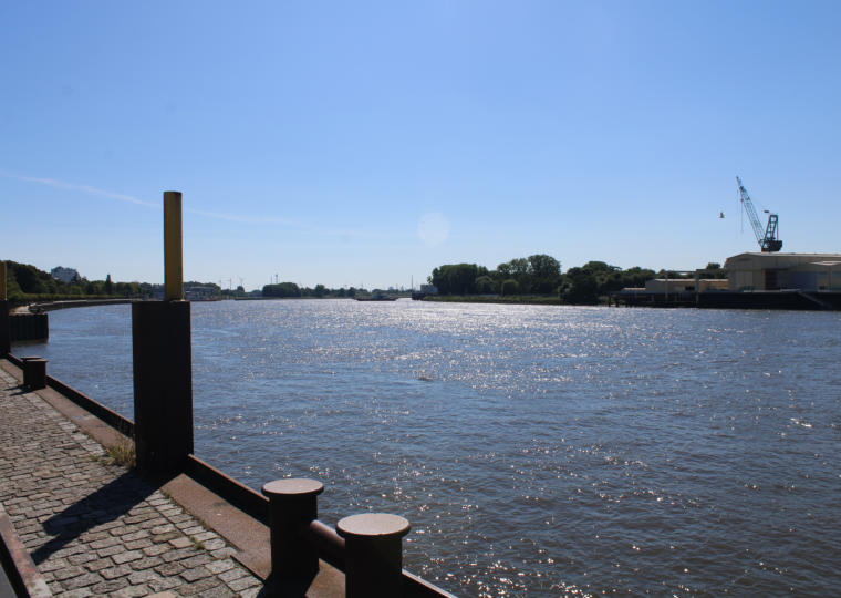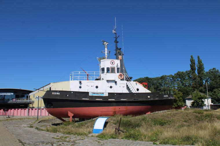 Du bist nun „steil“ bergab zur Weser gekommen. Große Teile von Vegesack liegen auf einem Hochufer, welches aus eiszeitlichen Sandablagerungen und einer Grundmoräne gebildet wird. Dadurch ist die heutige Innenstadt natürlicherweise vor Hochwasser der Weser geschützt. Erst im 19. Jahrhundert dehnte sich Vegesack in diesen Bereich aus. An dieser Stelle lag der mittelalterliche Flecken Fähr, wo es bereits um das Jahr 1305 eine Fähre über die Weser gab. Zu dem Ort führte ein alter Hohlweg, der Fährgrund. Es war eine 800 Meter lange und bis zu 15 Meter tief eingeschnitten Schlucht, sodass man hier relativ leicht das sonst sehr steile Weserufer erreichen konnte. Schon im Spätmittelalter war es eine wichtige Fährverbindung für den europäischen Ochsenhandel. Die Tiere wurden auf Märkten in Jütland und dem heutigen Schleswig-Holstein angeboten.Nachdem die Händler dort Tiere gekauft hatten, trieben sie diese nach Holland (Niederlande). An dieser Stelle querte eine wichtige Handelsroute, sodass die wenigen Einwohner von Fähr von dem Ochsenhandel gut leben konnten. Im 16. Jahrhundert wurden hier jährlich rund 30.000 Tiere über die Weser geschifft. Oberhalb der Weser gab es damals noch eine ausgedehnte Heidefläche, auf der die Tiere weiden konnten, bevor sie den Fluss überquerten. Heute erinnert kaum mehr etwas an diese lange Geschichte. Den tief in den Hang eingeschnittenen Fährgrund kann man heute nur noch erahnen.Mit dem Umbau des Vegesacker Stadtgartens um das Jahr 2000) erhielt das Areal sein heutiges Aussehen. Direkt weserabwärts lag die Werft Bremer Vulkan. Es war eine Großwerft, die jahrzehntelang der wichtigste Arbeitgeber in Bremen-Nord war. Die Werft wurde 1893 gegründet. Bis in die 1990er Jahre war es eine der größten und wichtigsten Werften weltweit. Durch die in den 1990er Jahren stark steigende Konkurrenz aus dem asiatischen Raum wurde der Schiffsbau in der Werft unrentabel, sodass die Werft im Jahr 1997 Konkurs anmelden musste.Der Schlepper Regina wurde 1965/1966 in der Werft Bremer Vulkan gebaut und erfüllte unterschiedliche Aufgaben. Nach einem Stapellauf holte er beispielsweise größere Holzstücke und Ketten aus der Weser. Zudem bewegte er den werfteigenen Schwimmkran in der Weser. Manchmal wurde der Schlepper auch für Dienst- und Ausflugsfahrten auf der Weser genutzt. Nachdem der Schlepper Regina 1987 einen Motorschaden erlitt, wurde er außer Dienst gestellt. Seit 1990 steht der Schlepper hier als technisches Denkmal.