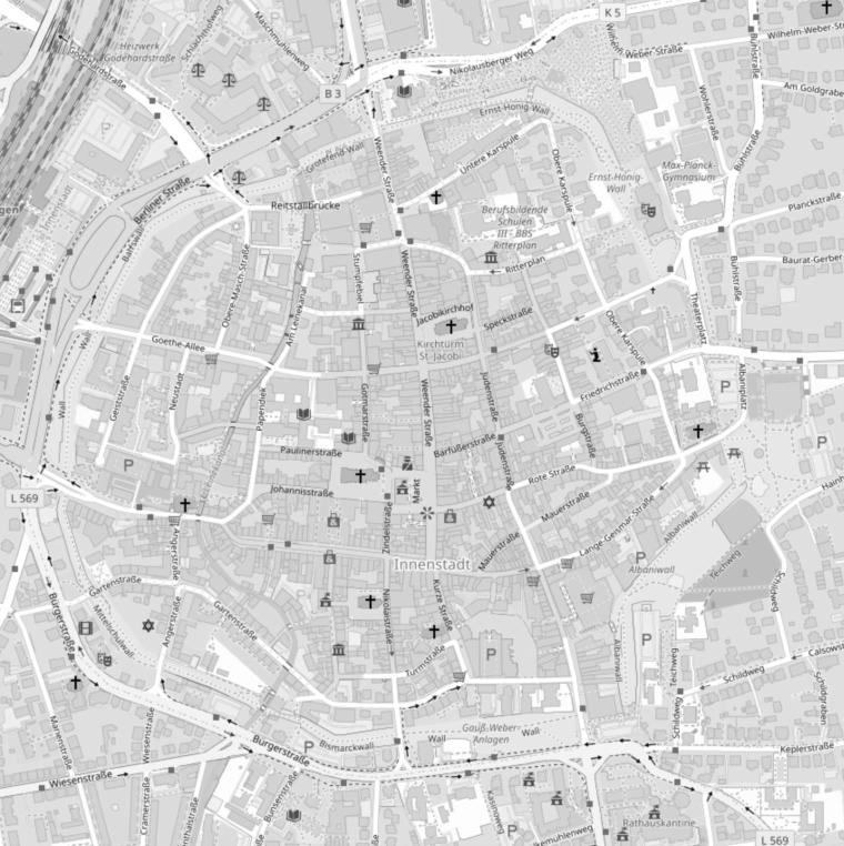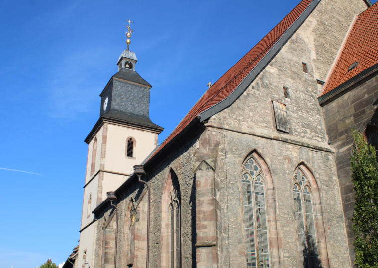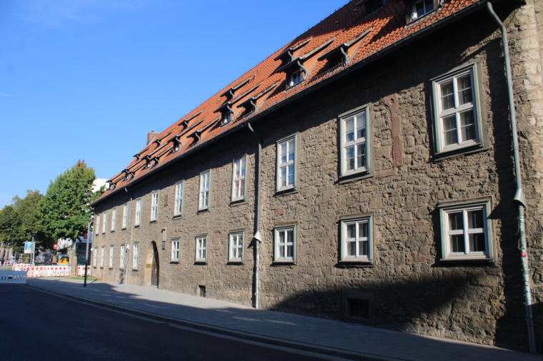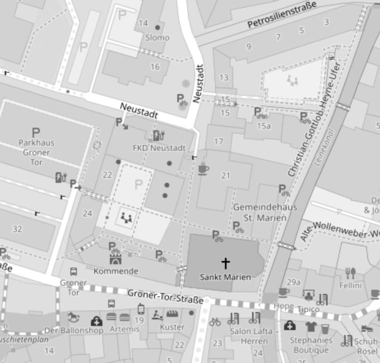 Die Kirche St. Marien liegt direkt am Ufer des Leinekanals. Die genaue Geschichte dieses Kanals ist bis heute nicht geklärt. Archäologische Ausgrabungen entlang des Kanals ergaben, dass es sich ursprünglich um einen Seitenarm der Leine handelte. Seit dem Mittelalter nutzten die Göttinger das Wasser und drängten den Wasserlauf in ein enges Bachbett.Nach der Gründung der Stadt Göttingen (vgl. Station 1) war der Leinekanal für viele Jahrzehnte die Stadtgrenze nach Westen. Der Bereich westlich des Kanals gehörte weiterhin zum Herzogtum Braunschweig-Lüneburg und wurde vom Herzog selbst verwaltet und entwickelt. Er ließ westlich des Kanals ab 1290 die „Neustadt“ errichten. Diese Siedlung war ein machtpolitisches Gegengewicht zur Stadt Göttingen und sollte verhindern, dass der Stadtrat zu mächtig wurde. Zu dieser Zeit wurde die Kirche St. Marien errichtet, der Kirchturm diente zugleich als Stadttor zur Neustadt.In den darauffolgenden Jahrzehnten kam es zu einem Machtkampf zwischen der Göttinger Bürgerschaft und dem Herzog von Braunschweig-Lüneburg. Schlussendlich gewann die Göttinger Bürgerschaft den Zwist und zwang den Herzog 1319 zur Aufgabe der Neustadt. Er verkaufte die Neustadt an die Bürgerschaft. Anschließend wurde der Siedlungsbereich der Neustadt durch verschiedene neu gegründete städtische Einrichtungen gestärkt. Dadurch zeigten die Bürger ihre Macht gegenüber dem Herzog.Bevor die Neustadt jedoch in der Stadt Göttingen aufging, schenkte der Herzog von Braunschweig-Lüneburg im Jahr 1318 die Marienkirche dem Deutschen Orden. Anschließend errichtete der Orden den an die Kirche angrenzenden Wirtschafts- und Verwaltungshof. Der Orden erwarb in den darauffolgenden Jahrhunderten große Ländereien rund um Göttingen, welche er an Bauern des Umlandes verpachtete (verlehnte). Dadurch entwickelte sich der Deutsche Orden zu einem bedeutenden, mächtigen und reichen Orden in der Stadt. Ab 1324 war die Ordenskirche auch eine bedeutende Pfarrkirche in der Stadt und wurde immer wieder erweitert und umgebaut. Erst im Zuge der Säkularisation um 1809 wurde die Macht des Deutschen Ordens gebrochen und die Kirche fiel an die Stadt.Der heutige Bau stammt zu großen Teilen aus dem 16. bis 18. Jahrhundert, während das Kircheninnere erst im späten 19. Jahrhundert sein heutiges Aussehen bekam. Dadurch ist kaum noch etwas von der einst prächtigen mittelalterlichen und frühneuzeitlichen Ausstattung erhalten. Besonders sehenswert ist der Hauptaltar aus dem Jahr 1526. Er zeigt die Passions- und Mariengeschichte.
