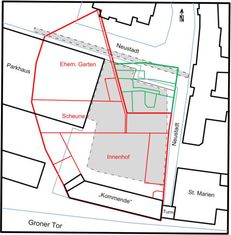 ungefähre Lage der Kommende mit Hauptgebäude , Nebengebäuden / Scheune und Garten