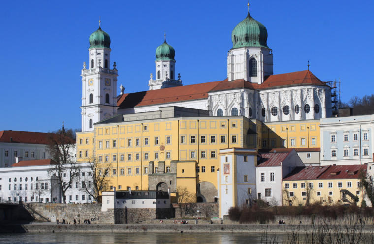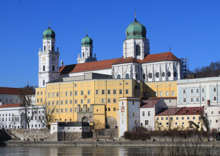 Von der Marienbrücke hat man einen wundervollen Blick auf die Altstadt Passaus, den Dom und der Häuserfront entlang des Inns. Hier geht die Geschichte des frühmittel-alterlichen Passaus weiter. Zu Zeiten der Gründung der Kirche St. Severin (Station 5) kam neben Severin auch der inzwischen heiliggesprochene Valentin von Rätien nach Passau. Er war Bischof von Rätien - Regensburg und Passau lagen in seinem Herrschergebiet. Er versuchte, die keltische Bevölkerung zu bekehren. Dies funktionierte jedoch nur bedingt, da der keltische Glaubenskult tief in der Bevölkerung verwurzelt war.Erst durch die missionierende Aktivität von Bonifatius wurden die keltischen Stämme schlussendlich bekehrt und das Bistum Passau 739 begründet. Die ersten Bischöfe des Bistums agierten geschickt und ließen das Bistum innerhalb kürzester Zeit zum größten Bistum des damaligen Deutschlands anwachsen. Es reichte zwar nicht weit nach Westen, jedoch umfasste es weite Teile des heutigen Österreichs. Eines der heute erhaltenen Zeugnisse dieser langen Geschichte ist die Alte Residenz von Passau, die 1173 erstmals urkundlich erwähnt wurde. Durch die vielen Stadtbrände wurde das Gebäude im Laufe der Zeit mehrfach schwer beschädigt und danach wiedererrichtet. Heute findet man im Gebäude der Alten Residenz die Bausubstanz aus dem 14. bis 17. Jahrhundert. Um 1750 zog der Bischof in die Gebäude der Neuen Residenz (Station 10), während die Alte Residenz von bischöflichen Behörden genutzt wurde. Im Zuge der Säkularisation um 1803 wurde die Residenz verstaatlicht und ab 1808 vom neu gegründeten Landgericht bezogen.Direkt am Ende der Brücke steht das heutige Theater Passau mit seiner langen Geschichte. Im Jahr 1645 errichtete der Fürstbischof an dieser Stelle ein Ballhaus. Als das Haus im 18. Jahrhundert an Popularität verlor, wurde das Gebäude komplett umgestaltet und 1774 als Hofopernhaus wiedereröffnet. Es war eines der ersten fürstbischöflichen Opernhäuser in Deutschland, welches nicht nur der fürstbischöflichen Familie offenstand, sondern allen Bürgern der Stadt. Im Zuge der Säkularisation wurde das Opernhaus aufgelöst.Bereits 1806 konnte es als königliches bayrisches Theater wiedereröffnet und so die Tradition fortgeführt werden. Im Jahr 1882 wurden massive Brandschutzmängel festgestellt, es drohte die Zwangsschließung. Daraufhin kaufte die Stadt Passau das Gebäude und ließ es entsprechend umbauen. Nur ein Jahr später wurde es wiedereröffnet. Auch heute wird das Theater als Stadttheater genutzt und konnte seine barocke Ausstattung bewahren. Der Theatersaal ist ein wunderschöner barocker Saal, der sehr sehenswert ist.
