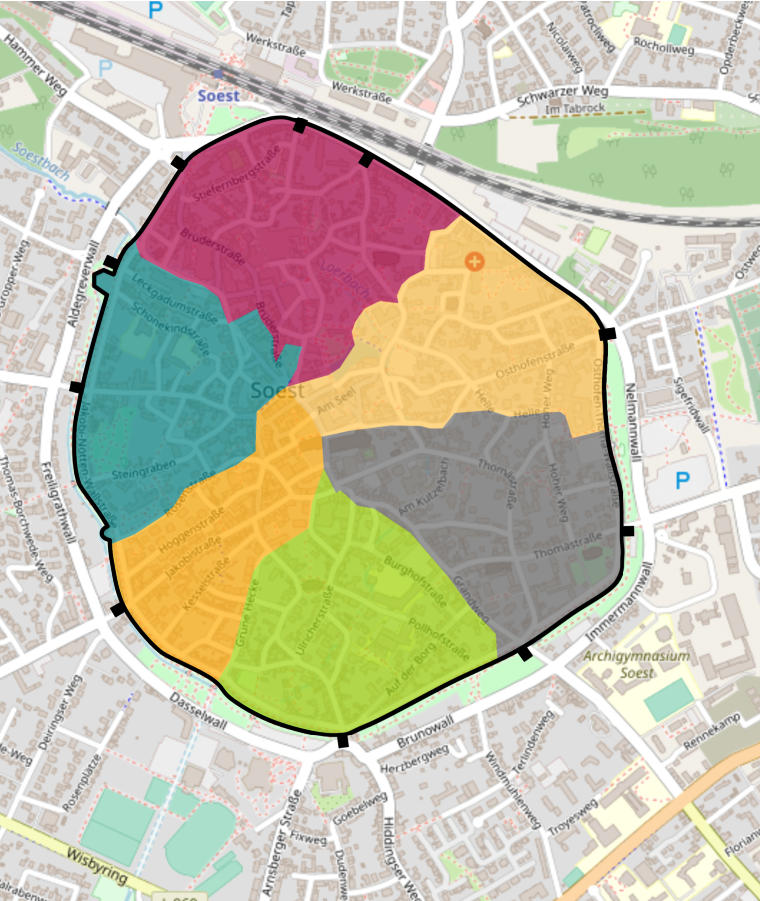 Hofe in SoestNordhofe: Brüdertor, Schültingertor, Walburgertor, Hauptwege sind die Brüderstraße und die WalburgerstraßeGroße Westhofe, auch Nöttenhofe: Nöttentor, Hauptweg ist die NöttenstraßeKleine Westhofe: Jakobitor, Hauptweg ist die JakobistraßePaulihofe: Paulitor, Hauptweg ist die PaulistraßeThomaehofe: Grandwegertor, Thomaetor, Hauptweg sind der Grandweg und die ThomaestraßeOsthofe: Osthofentor, Hauptweg ist die Osthofenstraße