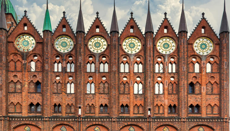 Die prächtige Schaufassade entstand um 1400 und gibt dem Rathaus sein typisches Aussehen. Sieben schlanke Pfeiler werden durch Spitzhelme abgeschlossen. Die Bereiche zwischen den Pfeilern werden durch offene Bögen und Blendbögen verziert. Im Giebel sieht Einsätze mit Sternen aus Kupferblech. Den Rand der Giebel zieren Krabben.