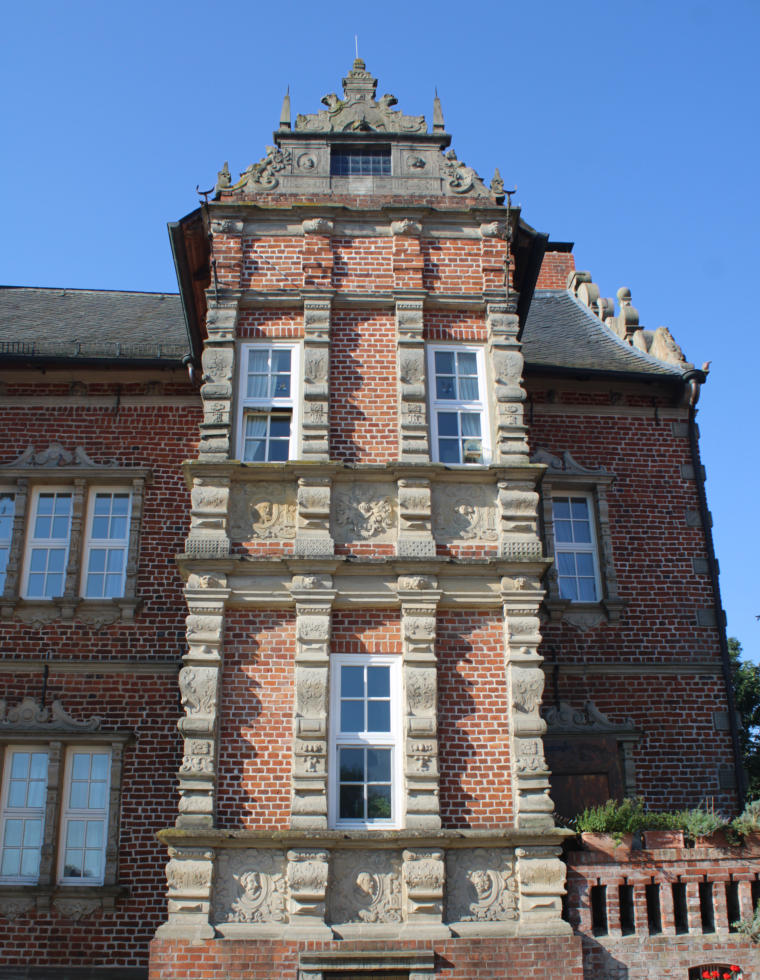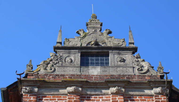 Die Schaufassade des Erbhofes ist reich verziert. Nimm dir etwas Zeit, um die zahlreichen Details zu entdecken.