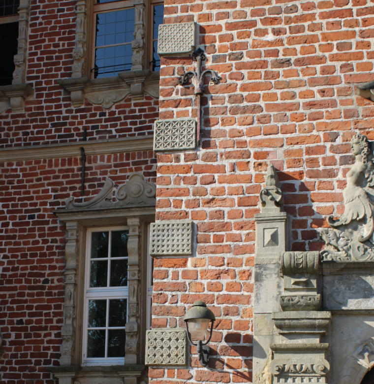 Die für die Weserrenaissance ganz typischen Utluchten (bodentiefe Erker) sind am Erbhof besonders reich verziert. Die senkrechten, nur zum Teil aus der Fassade stehenden Säulen [1] werden als Pilaster bezeichnet. Sie sind teils mit floralem Blattwerk [2], Diamatquadern [3] und anderem Schmuckwerk verziert. Unter den Fenstern sind zahlreiche Relifs bedeutsamer Personen abgebildet [4]. Zwischen den Etagen des Erbhofes wurde ein umlaufendes Gurtgesims als Zierelement eingefügt [5]. Die verwendeten Ziegelsteine [6] variieren minimal in ihrer Größe. Sie wurden noch von Hand geformt bzw. in Holzkästen hergestellt.