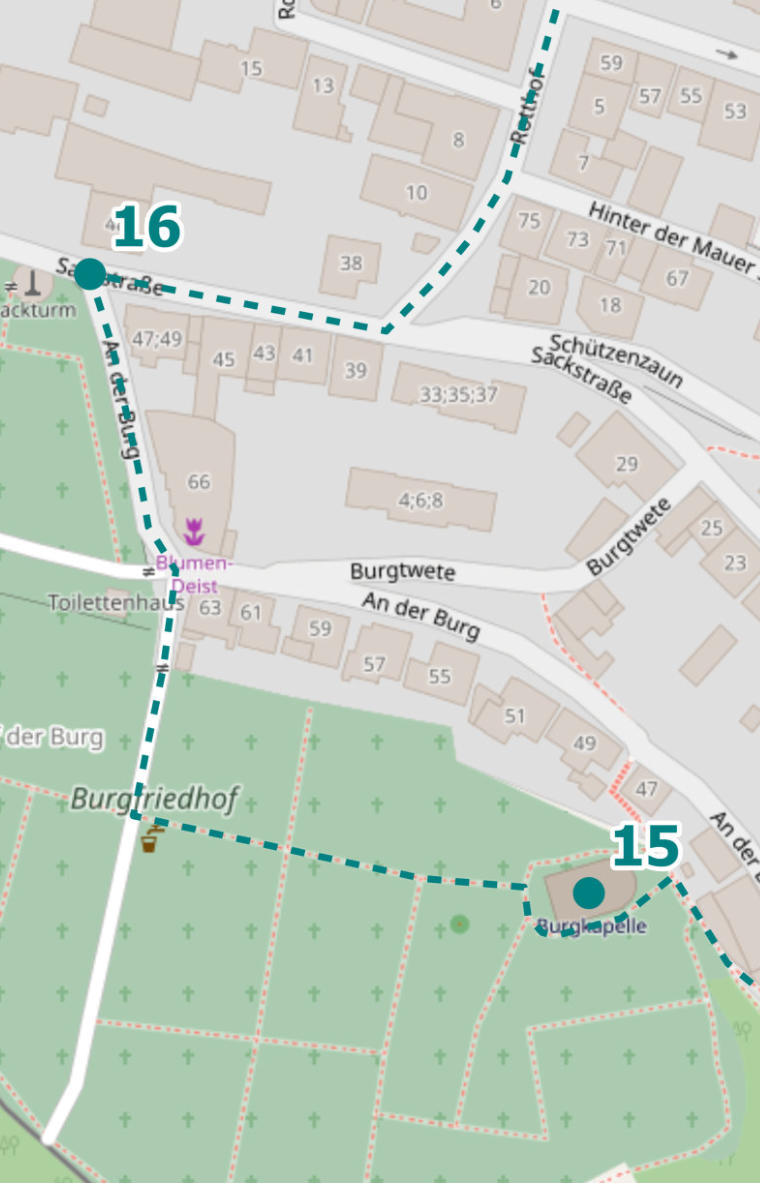 Folge der Straße weiter, den Sackturm siehst