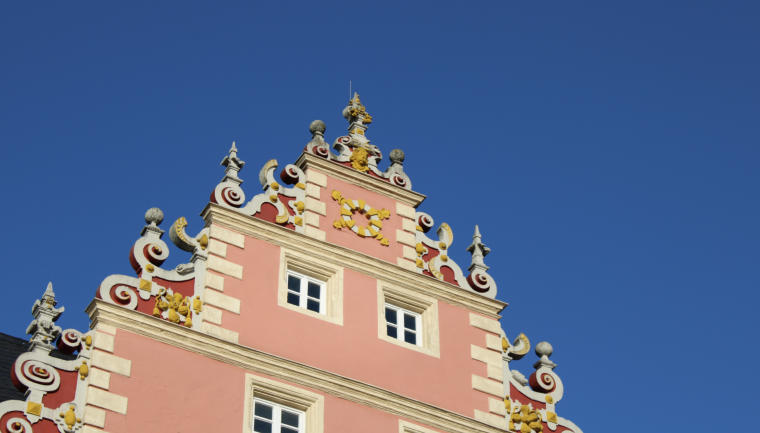 Kleine Obelisken verzieren den Giebel.